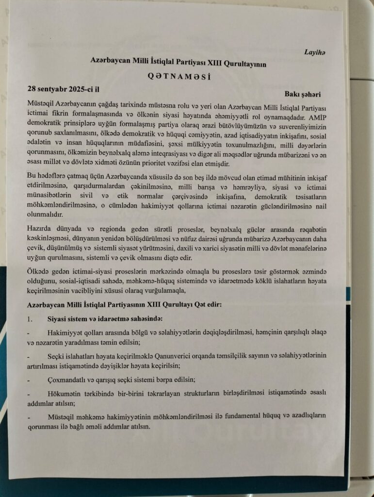 28 sentyabr 2025-ci il tarixində Azərbaycan Milli İstiqlal Partiyasının (AMİP) XIII Qurultayı keçirilib. Qurultayda partiyanın gələcək fəaliyyət istiqamətlərini müəyyən edən və ölkənin ictimai-siyasi həyatına dair mühüm mövqeləri əks etdirən Qətnamə qəbul olunub.